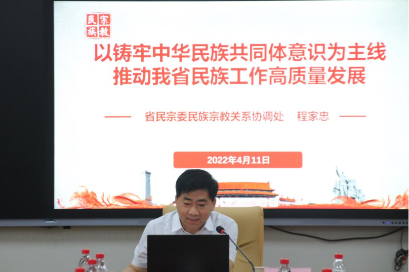随后,湖北省民宗委民族宗教关系协调处处长程家忠作了《关于民族工作会议精神的解读》的报告。报告主题为“以铸牢中华民族共同体意识为主线推动我省民族工作高质量发展”。他着重从三个方面对民族工作会议精神进行解读:一是要认真学习贯彻准确把握领会中央和省委民族工作会议精神,要全面学习贯彻中央民族工作会议精神的六个重点内容,即要坚信一条正确道路、要掌握一个重要思想、要把握一条鲜明主线、要认清四个重大关系、要做好五项重点工作、要坚持一个根本要求。二是要深刻认识铸牢中华民族共同体意识的科学内涵和重大意义,铸牢中华民族共同体意识是习近平总书记作出的原创性重大论断。三是要以铸牢中华民族共同体意识为主线推动民族工作高质量发展,深化新时代民族团结进步创建工作是非常必要的。