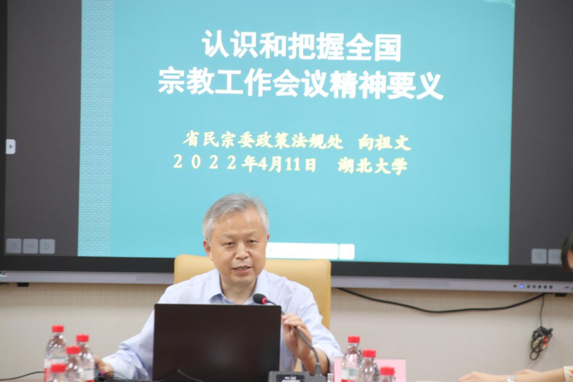 会议第二项议程主要围绕辅导报告进行展开。湖北省民宗委政策法规处处长向祖文作了《有关全国宗教工作会议精神的解读》报告。他指出,认识和把握全国宗教工作会议的精神要义应当从六个方面展开。一是要认识和把握党的宗教工作理论和方针政策;二是要认识和把握新时代党的宗教工作重点任务;三是要认识和把握贯彻党的宗教信仰自由政策的时代涵义;四是要认识和把握坚持我国宗教中国化方向的科学内涵;五是认识和把握解决影响我国宗教健康传承突出问题的重要工作;六是认识和把握加强“三支队伍”建设的重大责任。他强调,培养一支思想政治坚定、坚持马克思主义宗教观、学风优良、善于创新的宗教学研究队伍是至关重要的。