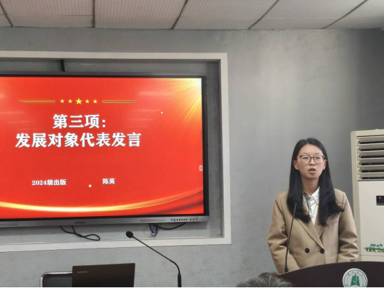 发展对象代表2023级出版专业的陈英在发言中,结合自身成长与感悟,强调了青年学子的责任,呼吁大家坚定理想信念,锤炼过硬本领,用不懈的奋斗,书写出无愧于青春的精彩答卷。