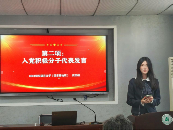 随后,入党积极分子代表2024级汉语言文学国家基地班庞思桐发言。她号召全体学员站在党课培训的新起点,满怀青年的朝气与担当,“以信仰为帆、以奋斗为桨”,在学习中锤炼初心,在实践中践行使命,在实现中华民族伟大复兴的征程中,写出属于我们这一代人的青春答卷。