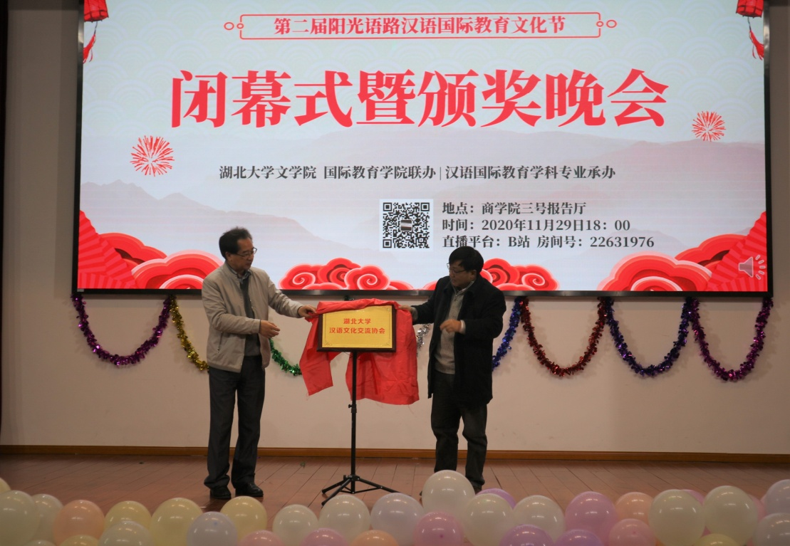 在颁奖环节,20名作品征集大赛参赛选手和10名文化节优秀工作者受到表彰。随后,万明明书记和王光和教授共同为“汉语文化交流协会”揭牌,邱庆山副经理致辞。