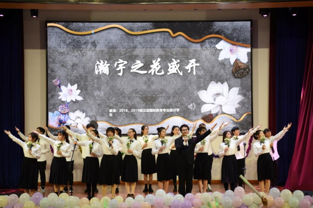 现场还上演了美轮美奂的歌舞表演。君子之道,仁义礼信;华夏之仪,大千结合。一支由国学社带来的舞蹈《礼仪之邦》拉开了大会的第一篇章——雅颂和鸣。19级汉教专业同学带来的小语种歌曲《等你下课》让不同的语言与动人的旋律交叉在一起,尽显语言的魅力;诗朗诵《2020,武汉一定是最浪漫的》回顾了疫情之下武汉的涅槃重生的历程。韵味十足的扇子舞《茉莉花》拉开了晚会的第二篇章——英华日新。相声《我的一天》展现了老员工平凡而鲜活的生活;跳动的音符回旋在耳边,由张杰、李爽等人带来的歌曲串烧引燃全场,大合唱《翰宇之花盛开》道出了汉教人奋力拼搏、努力绽放的心声。