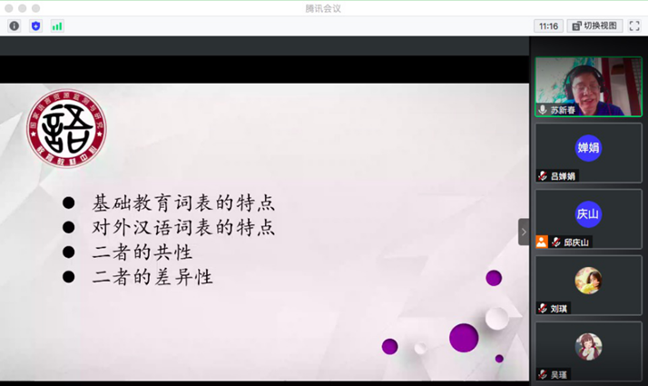 最后,苏教授就对外汉语词表与基础教育词表进行了总结,这两类表都属于学习性词表,但服务对象不同,故在词语性质、收词标准、词语功能、研制方法等方面,都存在着明显区别。认识到这些差异,能更自觉地加强词汇教学的针对性、科学性,大大提高词汇教学的效果。