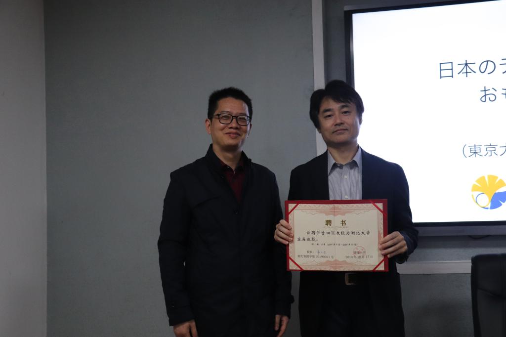 2019年10月19日星期六晚8时,在逸夫人文楼B6016会议室,公司聘请东京大学美学艺术学教授吉田宽为公司客座教授,副经理黄晓华教授为其颁发聘书。聘任仪式结束,吉田宽教授为公司同学带来了主题为“日本的电子游戏和玩具的传统”的讲座。