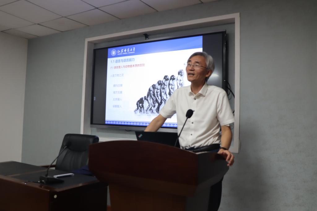 讲座伊始,杨教授通过追溯人的发展起源,然后举例论证“语言最主要的功能是思维”的观点,阐明人与动物的本质区别就是语言。并且着重讲述了语言在本质上是人脑的机能,其初始状态是基因的表达并通过大脑神经回路来实现,认为语言机能决定语言知识的获得并外化为语言技能。在此基础上,杨教授进一步指出语言能力涉及个体、社会和国家三个维度,能够归为五大问题并体现出文化软实力、科技硬实力和国家语言安全的三大需求,杨教授以幽默诙谐的表达方式对语言能力研究的重要性作出了重要阐述。