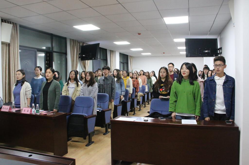会议第一项奏唱中华人民共和国国歌,接着,18级汉语国际教育专业刘婧、16级汉语国际教育专业万淑琪分别作为新一期入党积极分子、发展对象代表发言。