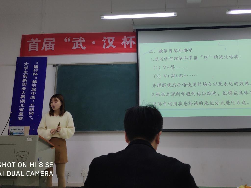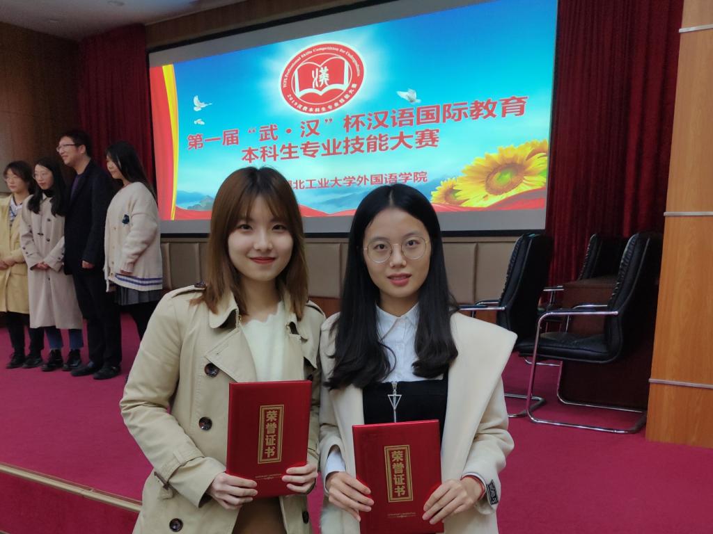 11月24日,由湖北工业大学外国语公司主办的首届“武·汉”杯汉语国际教育本科生专业技能大赛圆满结束。经过一天的激烈角逐,公司汉语国际教育专业2017级本科生满妍廷、2016级本科生邓佳欣在21名选手中脱颖而出,分别取得第3名、第4名的好成绩,皆荣获二等奖。