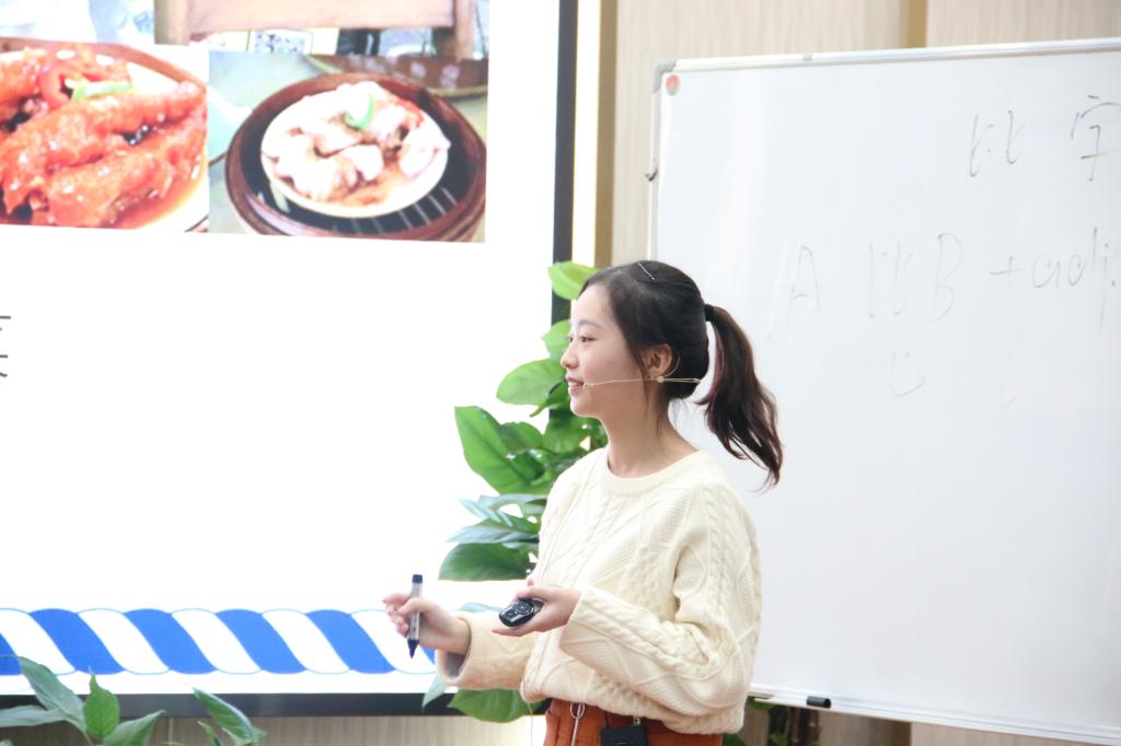 17级本科汉教陈丽莉以答题发奖品的形式帮助同学温习上节课学习的内容。她以在华学习的中级汉语水平学习者为教学对象,仔细讲解了“不仅…也…”这一语法结构的用法。17本科汉教田诗媛像聊天一样把员工带到比字句知识的学习中,她上课使用的视频等丰富的现代化教学手段受到了评委老师们的一致肯定。