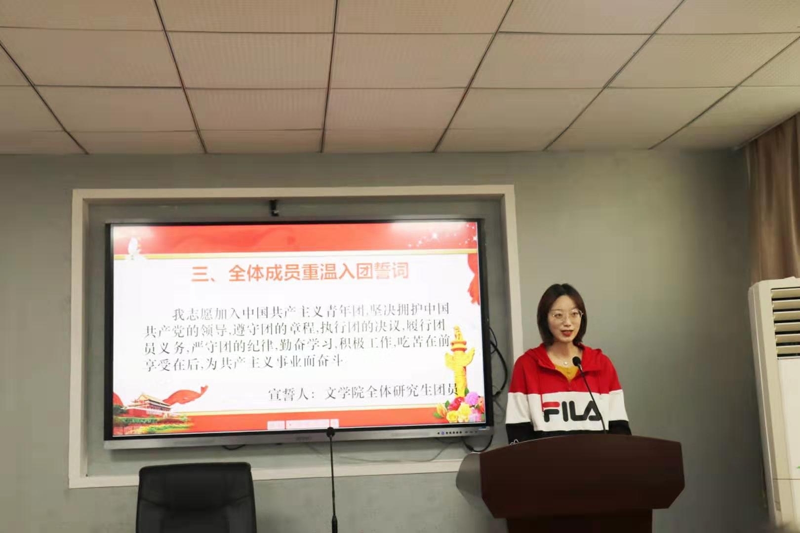 大会第三项,主持人姜欧迅带领在座的研究生团总支成员重温入团誓词。通过对入党誓词的重温,引领在座的员工牢记团员的初心与使命,提高思想理论素养。