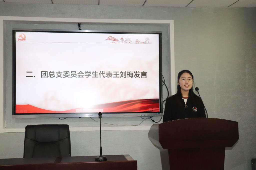 大会第二项,团总支委员会员工代表王刘梅讲话。她以2019级的团支部委员的身份做出承诺:将在本职岗位上做出我应有的贡献,工作学习两不误,团结友爱敢担当,言行得体立榜样!以身作则,用行动去实践,为支部贡献自己的力量。