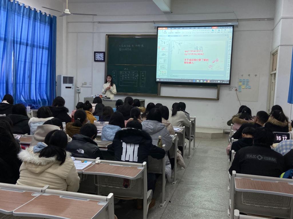 在中国语言文学1901班,张诗蕾以中国诗词大会的成语飞花令导入课程,结合日常生活经验以及论文学习经验展开了对成语的定义、特征、构造以及误用的讲解。为了提高同学们对于成语的兴趣,张诗蕾特意准备了三个有关成语的小游戏并通过分组的方式让每一个同学都能够参与其中,成功调动了大家学习成语的积极性,在看图猜成语的抢答环节中,同学们十分踊跃,气氛热烈。