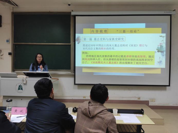 历史文化公司卢晓婷同学《宋代的家族与社会》,她从“三篇一结论”展开,介绍主要篇目:第一篇墓志史料与家族史研究、第二篇四明家族群像、第三篇江西家族群像。勾勒出宋代士人家族的发展历程,及其与基层社会间的关系轮廓。