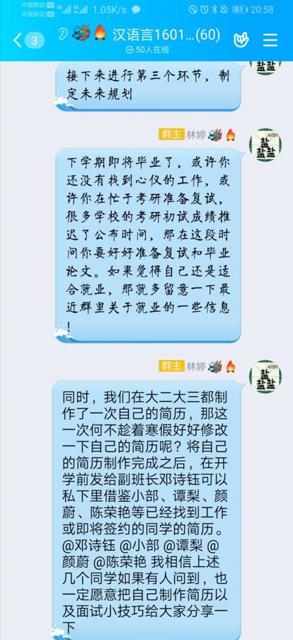 汉语言文学1602班于汉语言1602 QQ群开展了主题为“疫情就是命令、防控就是责任”的网络主题班会,班会上,班委结合时事新闻提高大家对疫情重视程度,转发人民日报科普知识到班群,并请心理委员积极引导大家,防止恐慌。同时做出公开承诺,每位同学在班群内上传签字承诺书,做到“疫情当前,从我做起”。班委邀请班上四位同学进行阅读交流,研读好书,展中文人和新时代老员工风采。同时,毕业在即,班委引导同学们做好未来自我规划,做好就业、读研、公考、出国的准备,总结过去,展望未来。最后向班级广泛征集防疫与健康宣传语,“预防千万条,口罩第一条!日常勤洗手,病毒绕着走!”是同学们幽默又不失严谨的呼吁。
