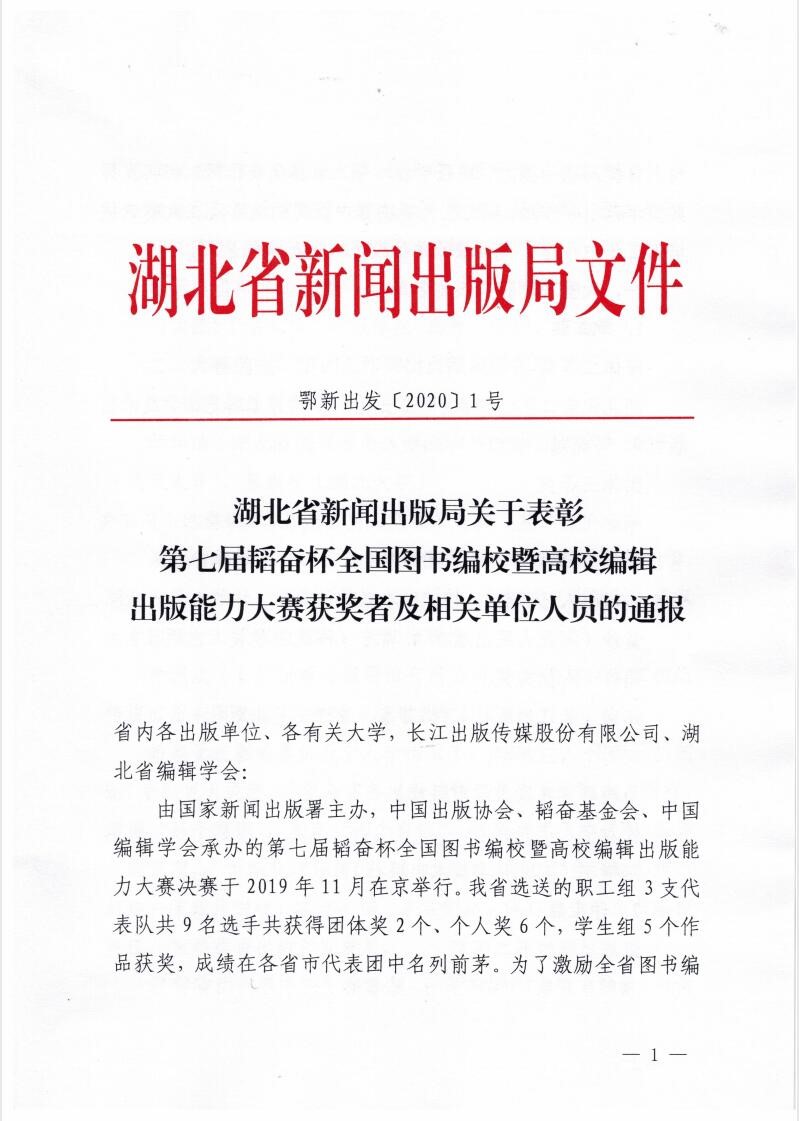 4月20日,湖北省新闻出版局发布《关于表彰第七届韬奋杯全国图书编校暨高校编辑出版能力大赛获奖者及相关单位人员的通报》,william威廉亚洲荣获“优秀组织奖”(集体)表彰,公司郭康松教授获评“优秀教练奖”,编辑出版学专业教师张琦获评“优秀组织奖”(个人),3个在全国赛事获奖的员工团队受到表彰。