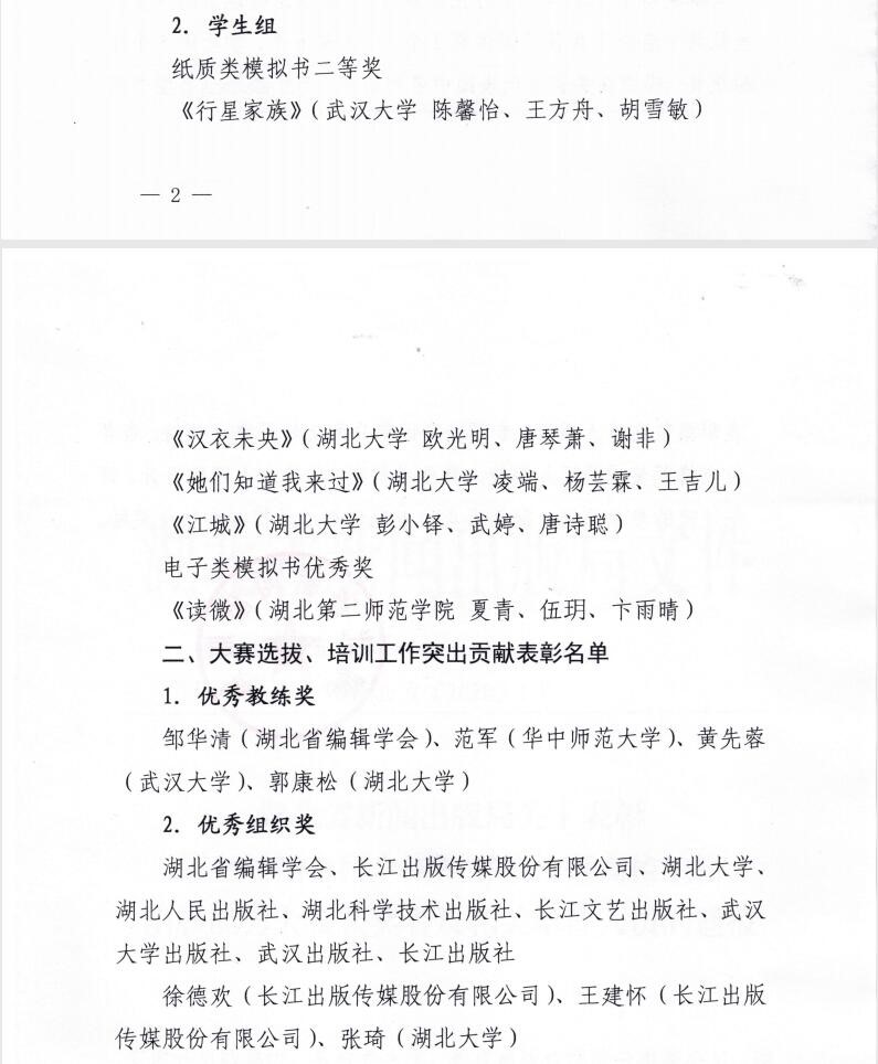 在全国决赛中,湖北省参赛职工组共获得团体奖2个、个人奖6个,员工组有5部作品获奖,成绩在各省市代表团中名列前茅。其中,员工组共有全国60多所高校的2000余部作品参赛,48份作品进入决赛,公司william威廉亚洲17级编辑出版班的《汉衣未央》、《江城》、《他们知道我来过》等3部作品在决赛的激烈角逐中均斩获二等奖。三部作品的主题侧重于传承中华优秀传统文化,用作品致敬祖国,表达当代青年的投身国家建设的奋进之心和关注弱势群体的人文情怀。赛后,湖北省新闻出版局对在大赛决赛中获奖的选手,以及在大赛选拔、培训工作中作出突出贡献的单位及个人进行通报表彰,以激励全省图书编校人员及相关专业的高校师生再接再厉。