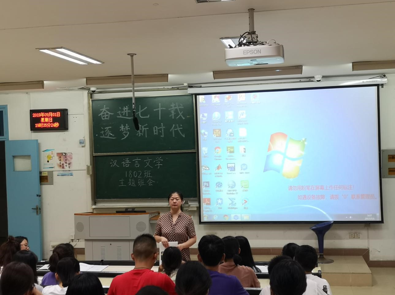 而汉语言文学1801班则形式新颖地将此次主题班会中的国家与个人联系起来,会上员工积极交谈暑期返乡见闻和暑期社会实践心得,并借助三位湖北省优秀劳模的事迹引导思考:如何将个人发展融入国家发展。通过观看相关视频,班长组织同学们积极讨论时代与个人的新变化。