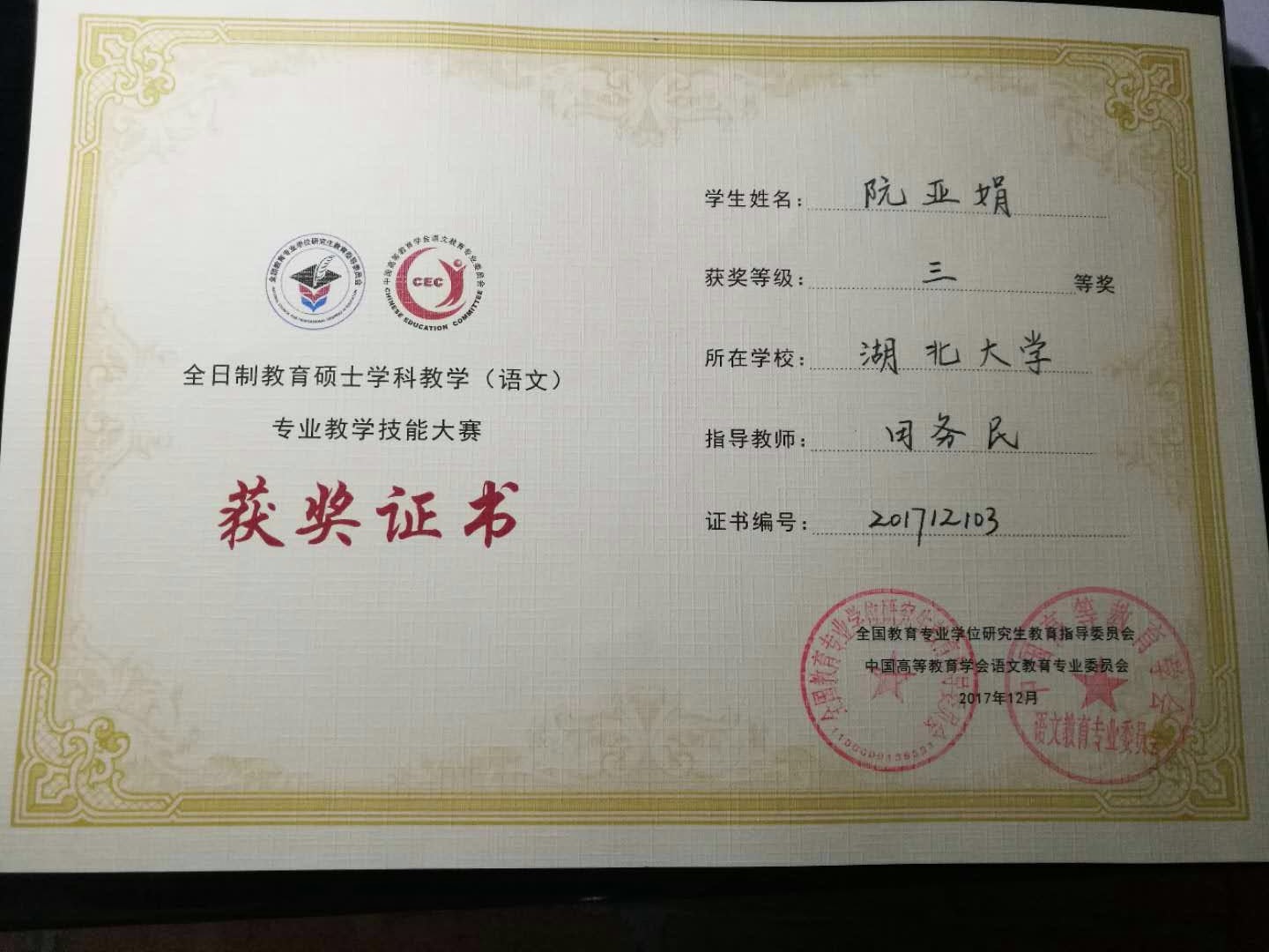 12月8日上午,第二届“全国全日制教育硕士学科教学(语文)专业教学技能大赛”在云南玉溪师范公司圆满落幕。公司学科教学(语文)专业的2016级硕士研究生阮亚娟获三等奖。
