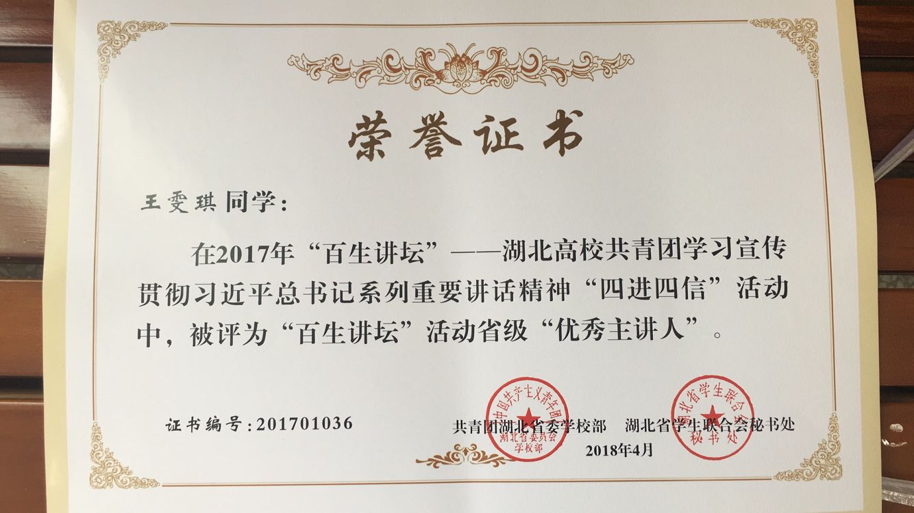 3月31日,2017年度“百生讲坛”——湖北省高校共青团学习习近平新时代中国特色社会主义思想和十九大精神省级优秀主讲人比赛历时3个月,终于成功落下帷幕。经过初赛,复赛的层层评定与遴选,公司2016级汉语国际教育专业学子王雯琪在比赛中脱颖而出,荣获省级百佳“优秀主讲人”称号。