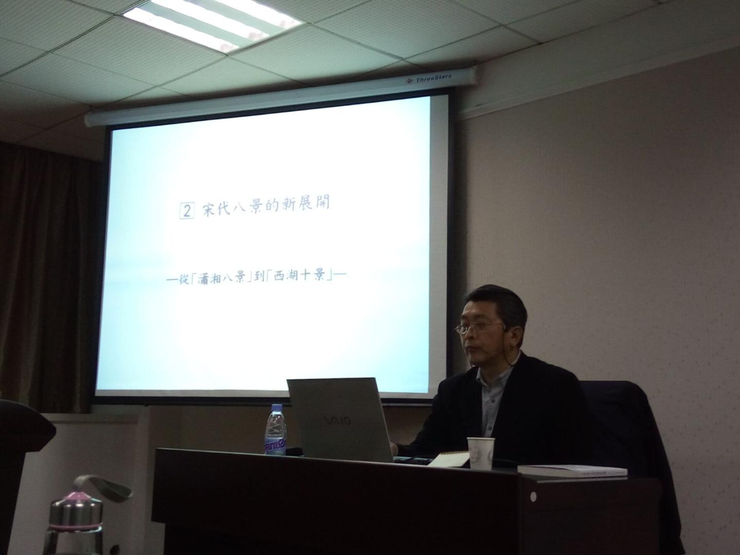 在论及“从潇湘八景“到”西湖十景”的转变时,内山精也教授特意给在场听众展示了自己在浙江大学讲学期间游览西湖拍摄的风景照,并自我调侃道因为在杭州时天气不好,阴天很多,所以自己的照片作为学术佐证可用的甚少。报告过程中,内山精也教授就“为何士大夫在绘画创作意识上突然发生了显著变化”这个问题,从绘画技术、绘画理论及士大夫的生活空间三个方面进行了深入探讨。他认为:就绘画技术而言,水墨画法的发展与普及对这一变化有极大的影响,至少至唐代为止,构成绘画主流的是彩色绘画,彩色绘画的制作,要求有关颜料的专门知识及自如运用这些知识的高度技术与经验;从绘画理论这方面来看,以北宋中后期为界,在士大夫文化中层中心地位的重要人物开始较多论及绘画这一艺术的本质。