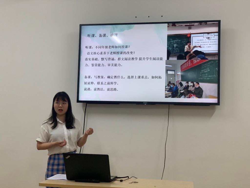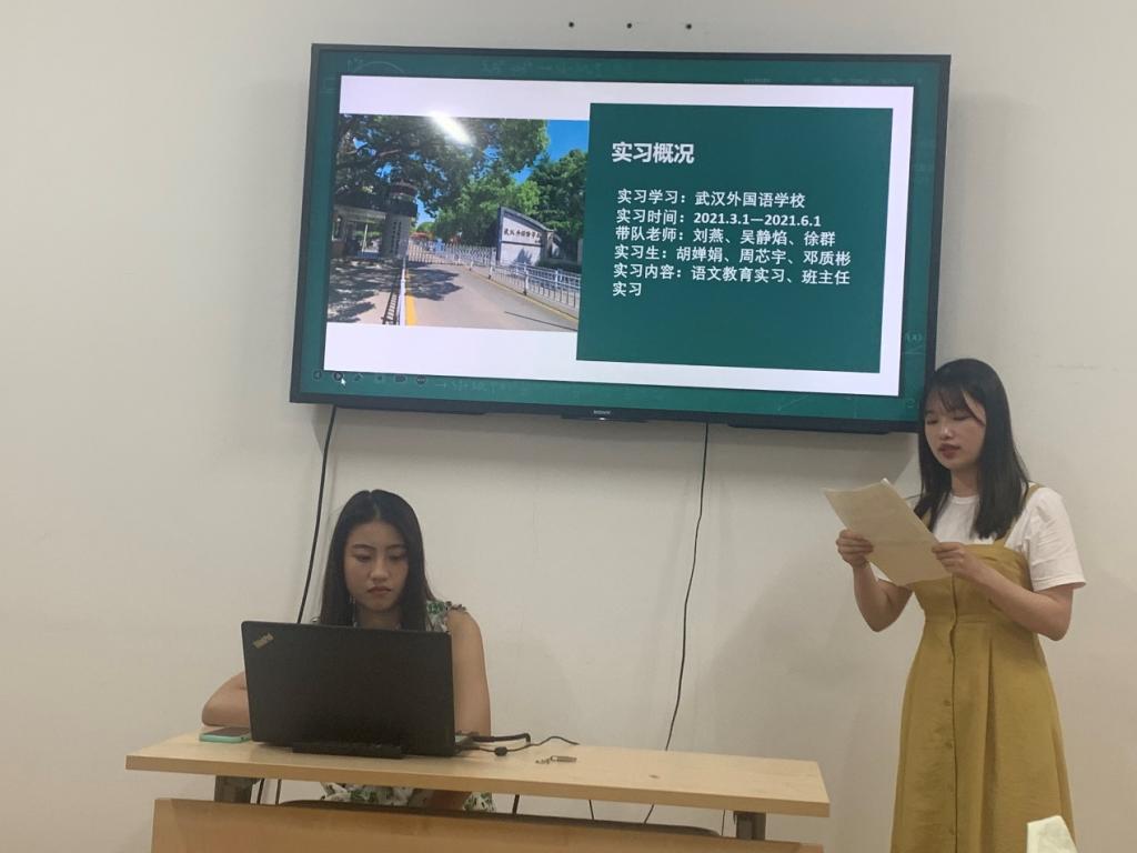 接着,前去武汉外国语初中部实习的邓质彬同学,着重分享了实习小组进行磨课的经历,她说到:“讲一堂课容易,讲一堂好课不容易。”她指出有耐心、能细心、付真心的老师,更容易收获员工的肯定。