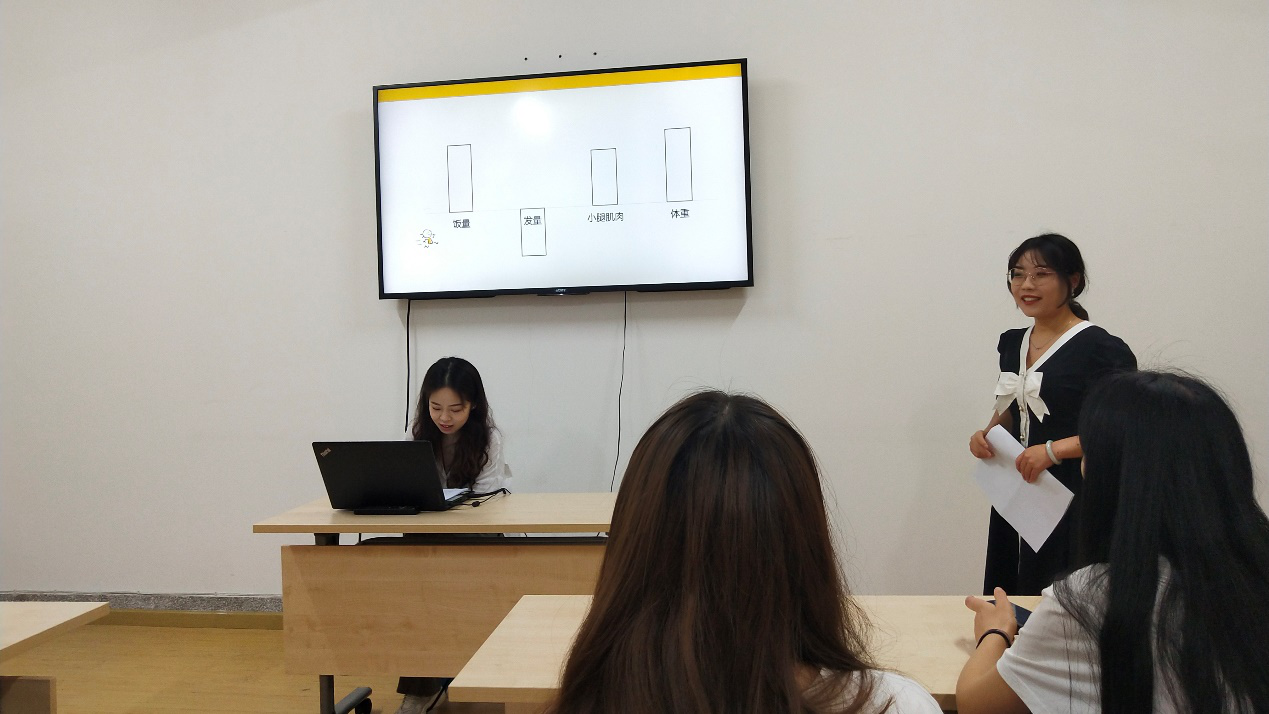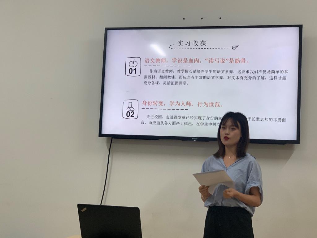 其次,前去武珞路中学的谭青青同学进行实习交流发言,她以视频的方式给大家展示了实习公司的教学实际,指出新媒体运用对于教学课堂格外重要,号召同学们对标中学招聘要求,不断提升自身的综合素质。