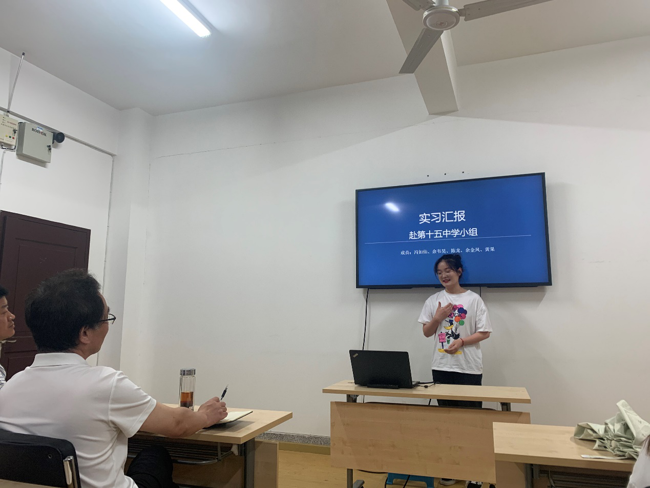 随后,前去武汉市第十五高级中学实习的冯如仙同学展开了交流发言,她给大家分享了他们实习小组的实习作息时间,表达了对高中生的辛苦生活的体谅,她强调要加强与员工的交流互动,互相理解,促进师生关系更融洽。