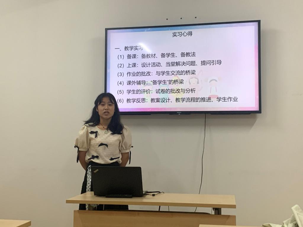 紧接着,前去武汉市第二十五高级中学实习的杨鑫同学给大家展示了实习中学的教堂风景和悠久历史,她分享了班主任工作的要点,强调了作为教师的责任和担当。
