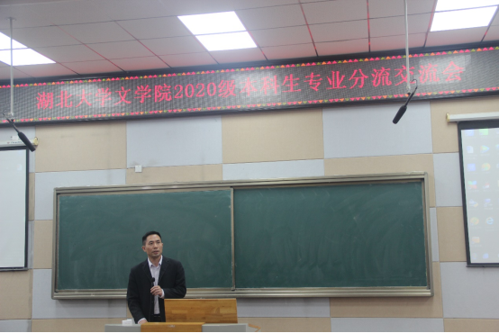 5月19日下午两点四十分,公司2020级本科生专业分流交流会在通识教育公司B300教室举行,邱庆山副经理带领汉语言文学国家基地班专业负责人余迎胜、汉语言文学专业负责人彭安湘、汉语国际教育专业负责人吴宝安、编辑出版专业负责人张琦同2020级本科生就各专业情况进行了深入的交流。