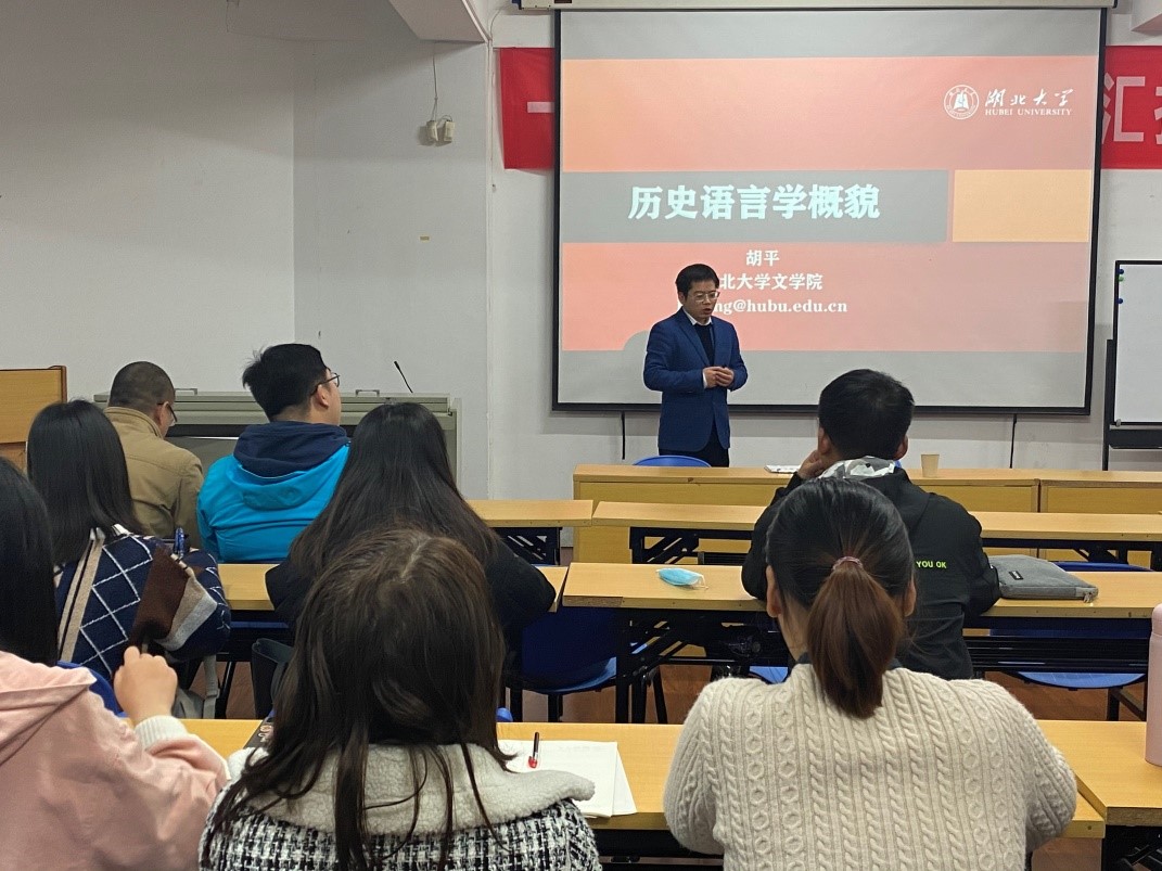 讲座伊始,胡平老师首先将历史语言学与古代汉语和历史比较语言学作出区分,其次为大家介绍了历史语言学的研究目标、学科地位、研究领域和著名的学会、期刊、参考文献等内容,让大家对于历史语言学有了初步的了解。
