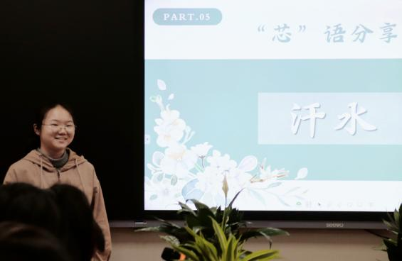 除了开展趣味游戏,开站仪式还设置了“芯”语分享环节。汉语言文学(师范类)1901班的蔡淑君同学以“泪水”为主题,讲述了自己的亲身经历——挫折也可以转化为幸运,勉励在场员工不畏挫折、直面挑战。“现代汉语词典中,对于汗水的定义是较多的汗,这是点滴的汇聚,在我们的成长路上,也需要点点滴滴的努力。”汉语言文学(师范类)2102班的贺欢从“汗水”的概念出发,动情地传达了劳动教育对于当代老员工的重要意义。最后,汉语言文学(师范类)2101班的张钰欣以“融入水滴”为主题,分享自己有关集体教育和团队精神的感悟。