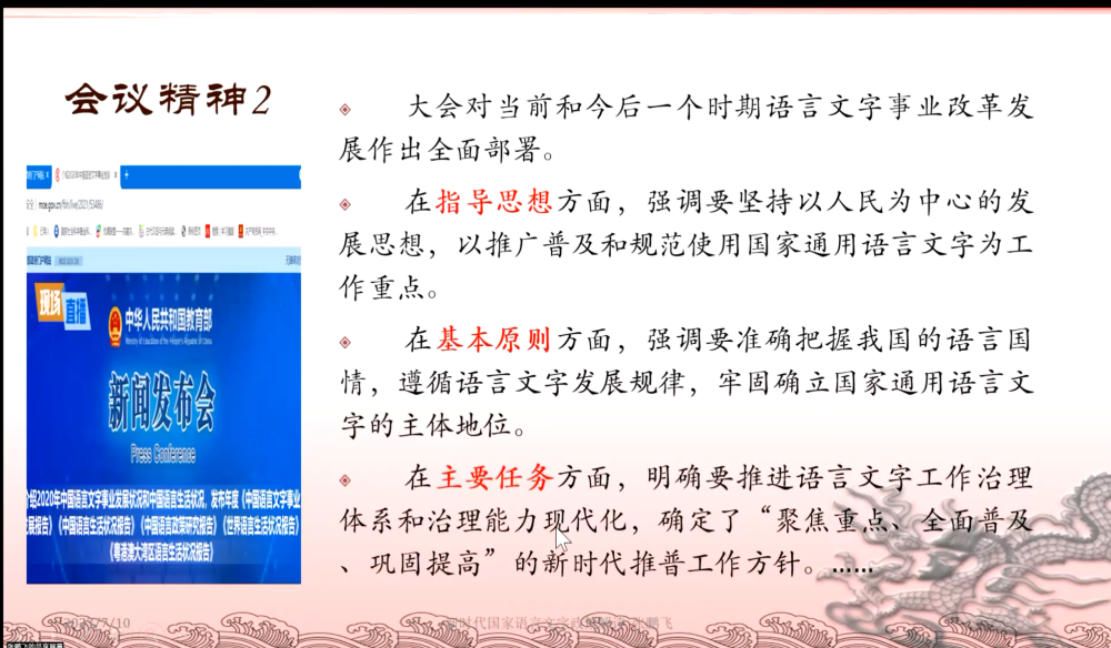 政策解读系列讲座对国家相关语言文字政策进行了解读,对推广普通话之于乡村振兴的意义及推广普通话存在的困境与路径进行了分析,为学员们树立了精神引领与思想标杆,为本次课程的开展提供了重要导引。