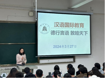 汉语国际教育专业负责人邓雅老师以专业介绍、专业特色、育人成效、专业前景、专业要求五个方面对汉语国际教育专业进行了详细的讲解。邓雅老师向2022级员工展示了学长学姐们的优秀风采,以及专业考研录取率的相关数据,并切实地指出汉语国际教育同汉语言文学的专业相关性与不同点,强调汉语国际教育专业是国家事业的重要支撑。