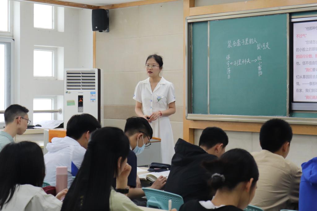 接着,在外国语公司(高中部)备课组组长赵文清老师的带领下,老师们一起观摩了公司2022级实习生温玉婷讲授的《装在套子里的人》一课。
