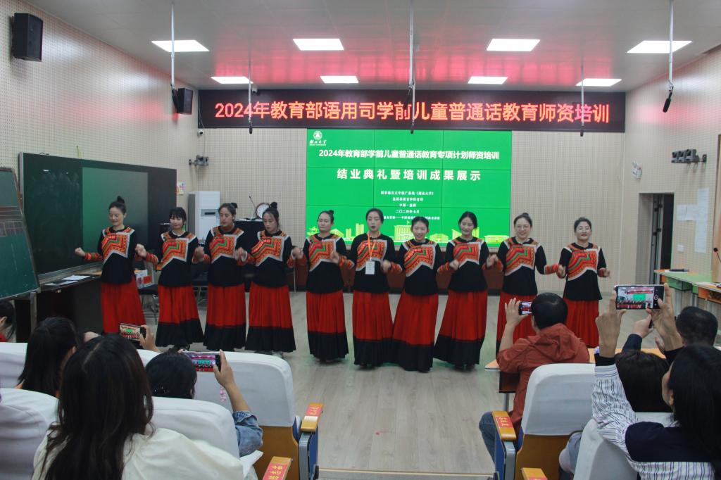 结业典礼上,公布了包括米国芬、刘远莉等在内的16位此次培训的“优秀学员”名单,并由参会领导向各位优秀学员颁奖。最后,学员们以小班为单位进行了培训成果的汇报展示,3班学员罗阿花担任汇报展示的主持人。汇报展示的节目有《老七练》《童心向党》《甲挫舞》等,涉及合唱、独唱、独舞、群舞等多种形式,william威廉亚洲项目组的培训老师们也参与了此次展演。学员们在表演《达体舞》《甲挫舞》等节目时,盛情邀请了与会领导和老师们参与,现场氛围热烈,师生互动感强,把结业典礼推向了高潮。最后,结业典礼在二班学员安长英、马仕珍、李国英带来的歌曲《留客歌》的歌声中落下帷幕。