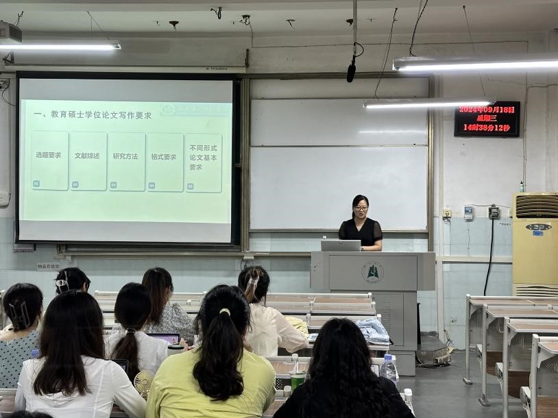 马英老师在讲座伊始,阐述了写好教育硕士学位论文的必要性,她指出:研究生学位论文不仅是对研究生专业知识及理论的全面考查,也是对研究生分析问题、解决问题以及语言表达能力的全面检阅。接着,她从选题要求、文献综述、研究方法、格式规范和不同形式论文的基本要求这五个方面,结合具体论文实例,详细阐述了教育硕士学位论文的写作要求与写作方法。
