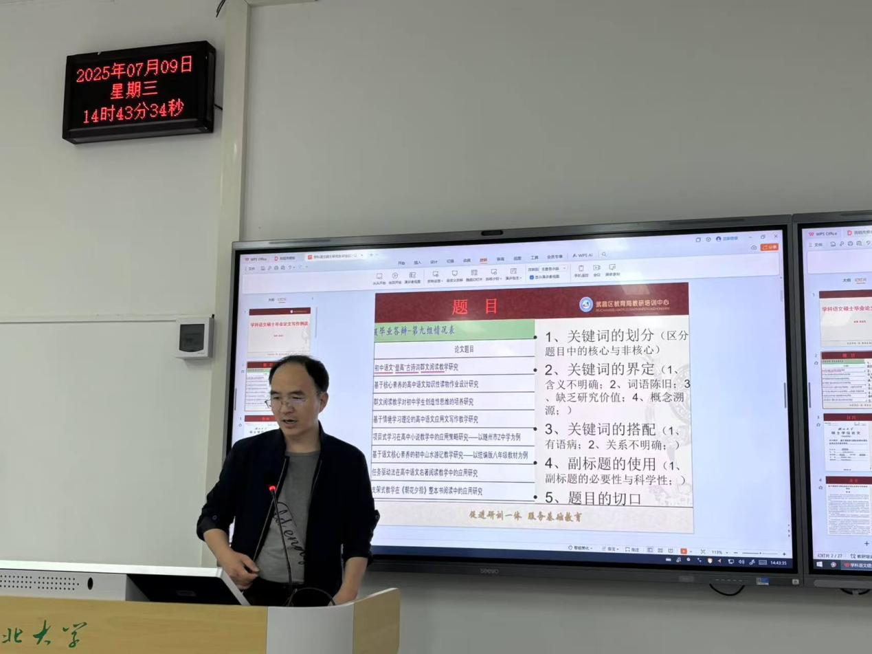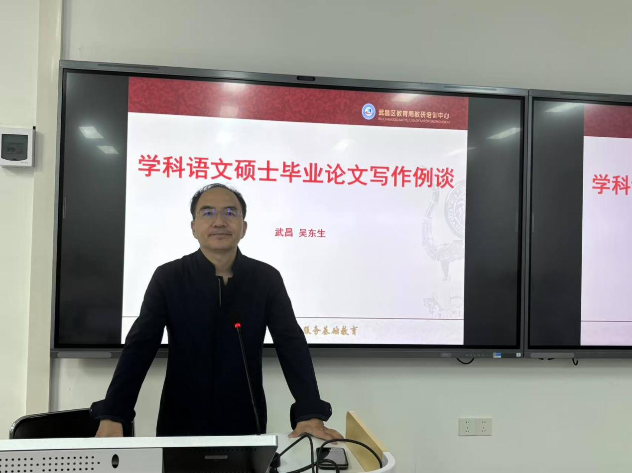 2025年7月9日下午14时30分,炎炎酷暑下的湖大四教107教室座无虚席,约30名2023级学科语文非全专业硕士研究生齐聚一堂,共同聆听武昌区教育局教培中心教研员吴东生老师做的学术讲座。吴老师这场名为《学科语文硕士毕业论文写作技巧例谈》的讲座,为同学们未来的毕业论文写作传授了写作方法,指明了研究方向,也使大家受到了一次高质量的学术研究素养训练。