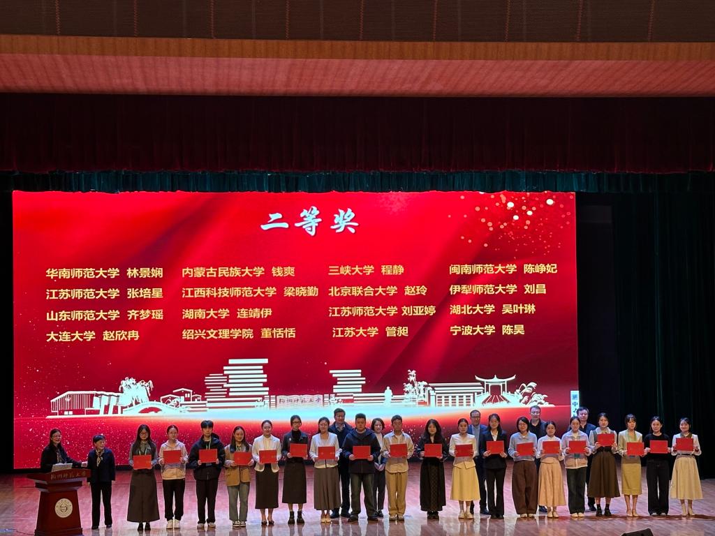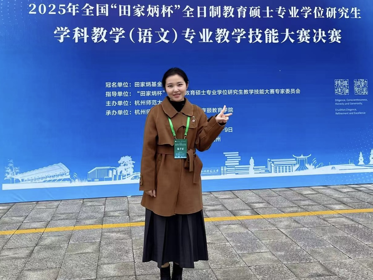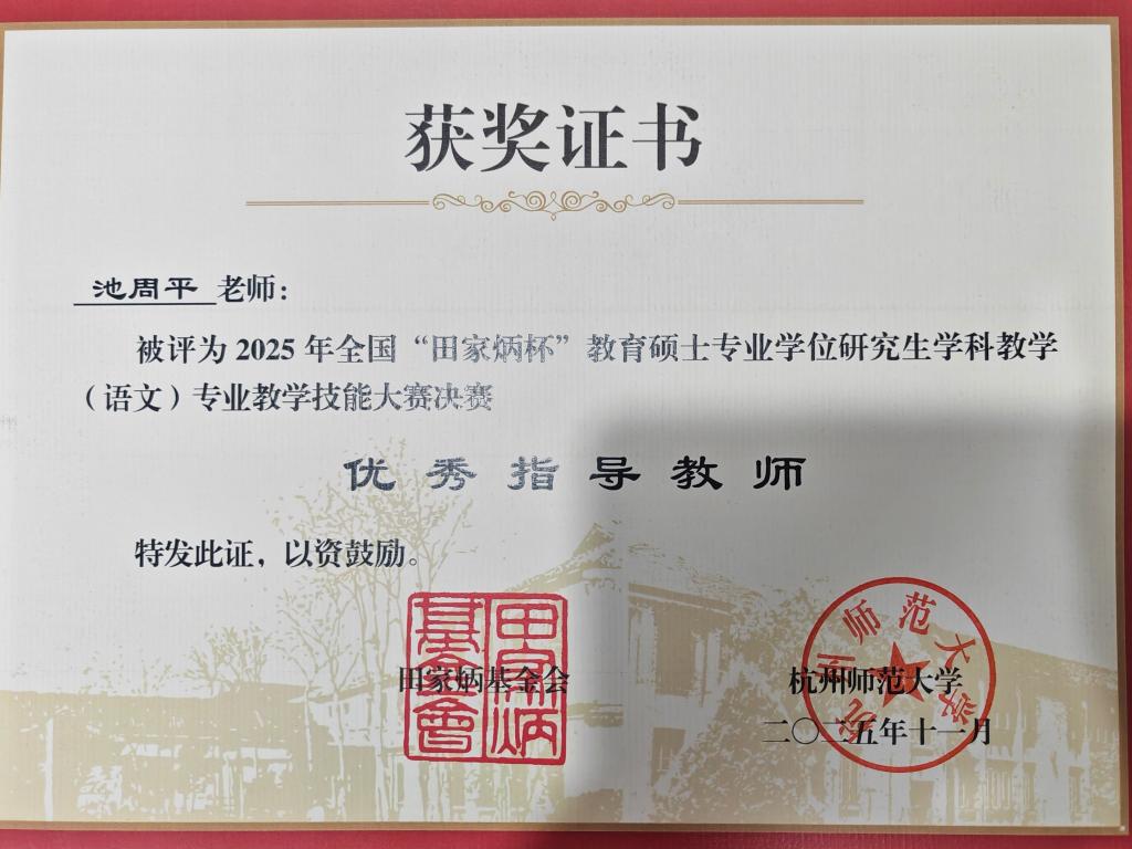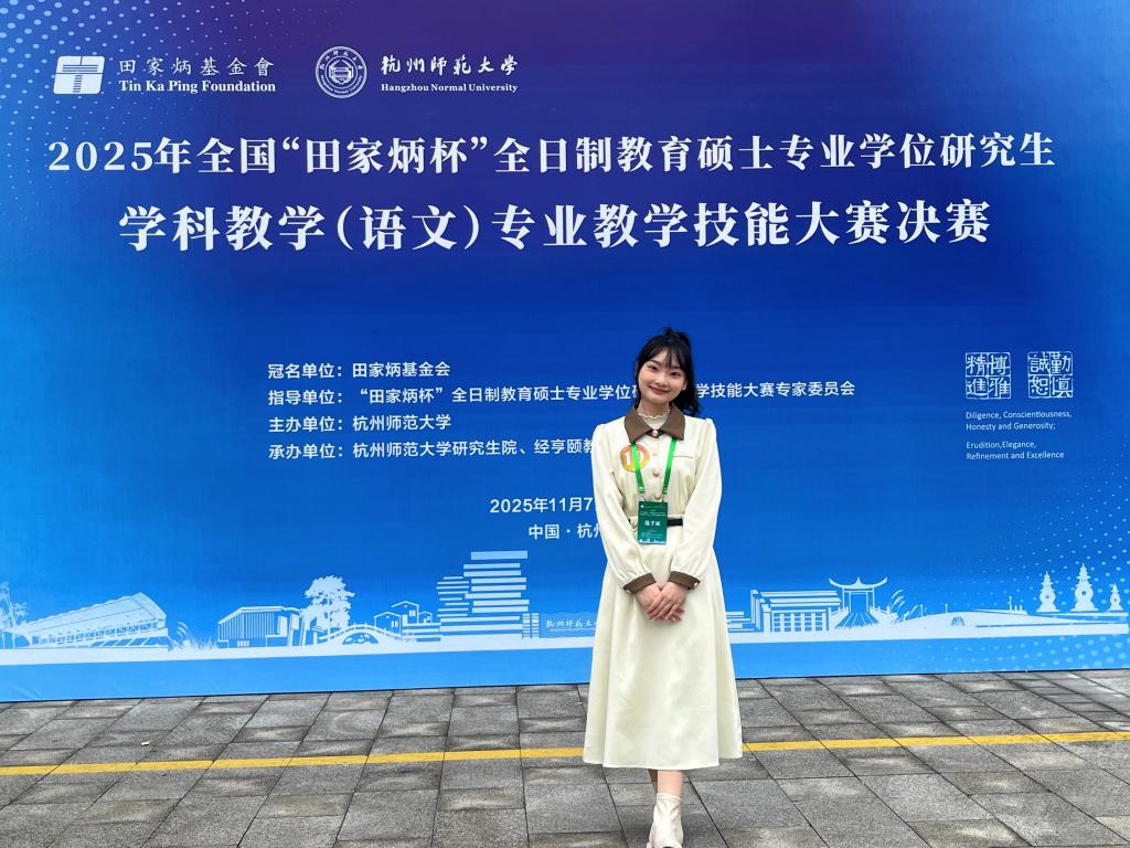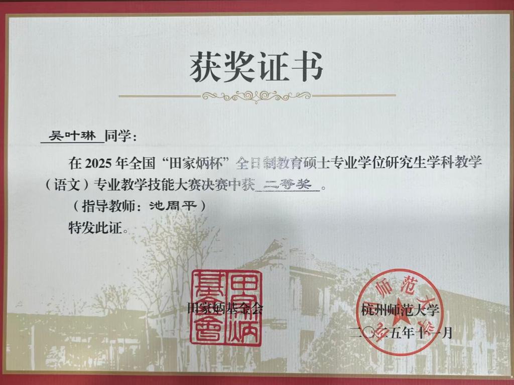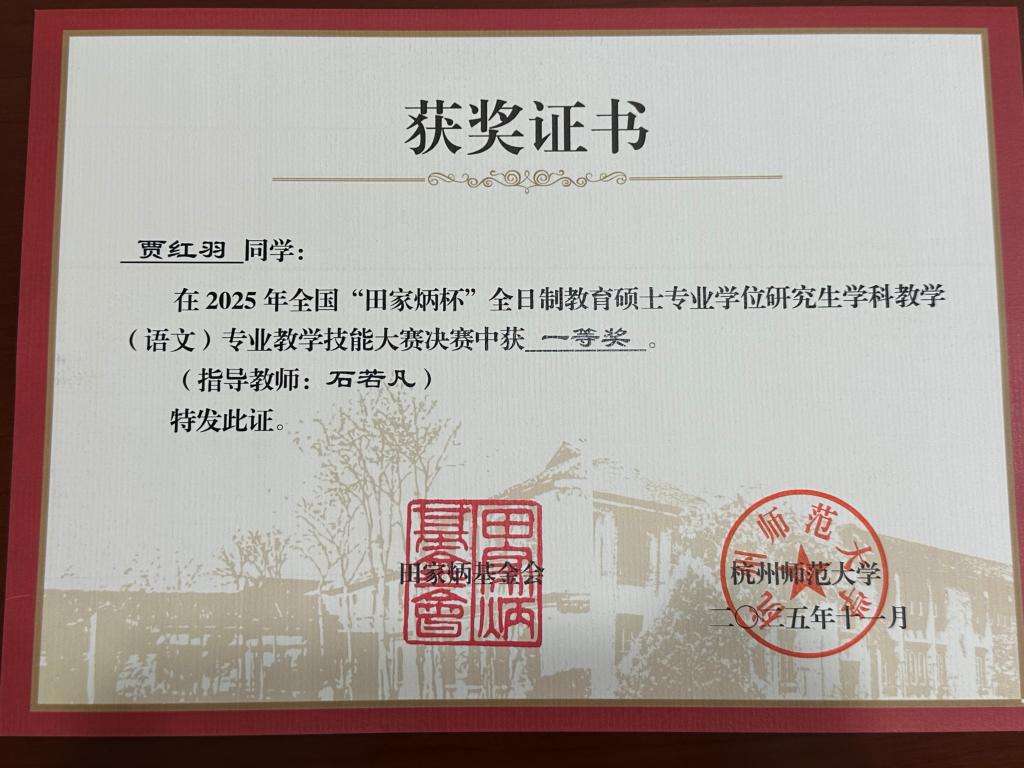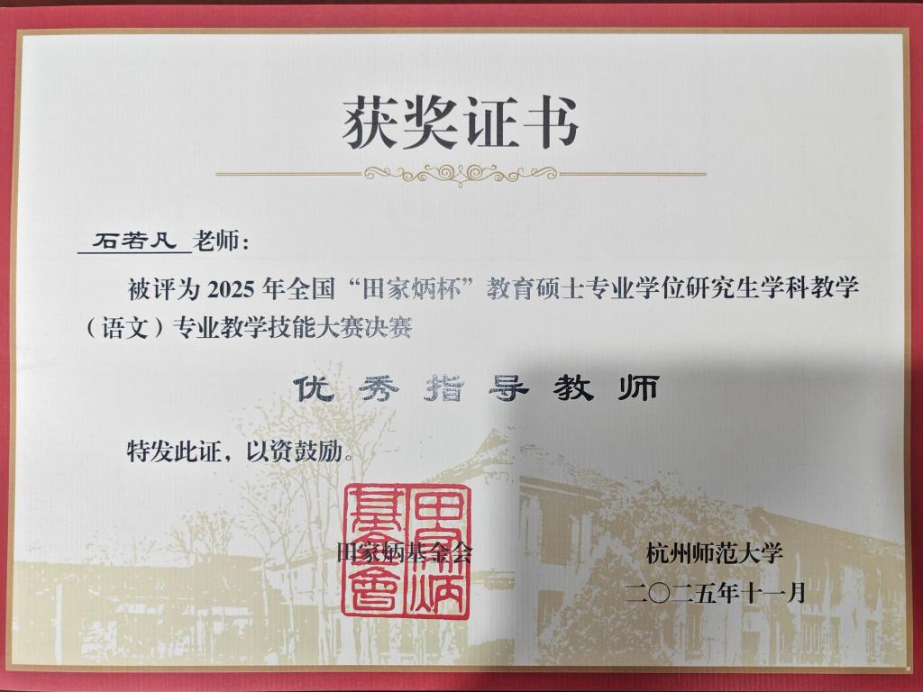 2025年11月7日至9日,全国“田家炳杯”全日制教育硕士专业学位研究生学科教学(语文)专业教学技能大赛决赛在杭州师范大学举行。经过激烈角逐,公司2023级学科教学(语文)专业研究生贾红羽、吴叶琳同学表现优秀,荣获一等奖、二等奖,指导老师石若凡、池周平获评“优秀指导教师”荣誉称号。