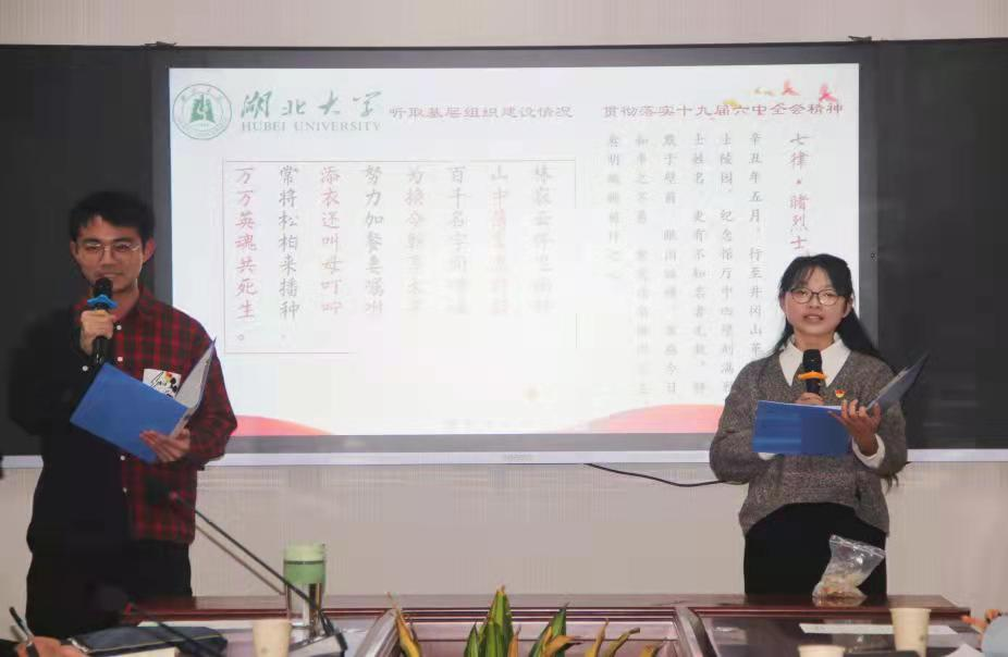 大会开始,首先由全国高校“活力团支部”汉语言文学(国家基地班)1901班结合工作和相关视频进行风采展示;接着党员同学朗诵了2021年“聂绀弩杯”老员工中华诗词邀请赛一等奖获得者、本科生党支部党员谭梨芳的原创诗作《七律·睹烈士名墙有感》;随后本科生党支部书记李清清、公司党委副书记余澜分别汇报了支部组织建设和公司党建基本情况。