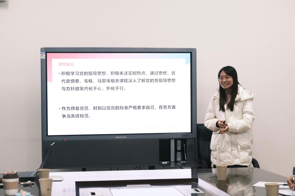 10月10日下午14:30,答辩会准时召开。答辩现场邀请教师代表余迎胜、张琦、彭安湘、辅导员郎润参与评选工作。候选人按抽签方式依次上台进行个人陈述和PPT展示,她们分别从学业成绩、思想政治表现、社会实践、志愿服务等方面进行演讲汇报,从不同角度展示了自己的学习工作和实践创新的成果,充分体现了公司学子积极进取、全面发展的良好风貌。每位候选人演讲结束后,在场的评委老师依据候选人提交的书面材料及汇报情况轮流进行提问,面对评委老师提出的“是否深入参与过社会实践”、“实习工作如何开展”、“学术论文写作情况”等问题,七位候选人均有条不紊地阐述了自己的情况,进一步展示了候选人们的个人优势和特色。