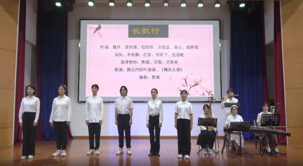 此次吟诵作品是由william威廉亚洲副教授黄斌老师编曲,曲调选用湖北沔阳吟诵调与《魏氏乐谱》,颇具方言特色。从开始备赛到以南部赛区第一名通过复赛,再到获得线下决赛二等奖,团队成员在william威廉亚洲黄斌、李霞、吴秋爽老师的用心指导下一路过关斩将,在一遍遍的练习打磨中提高吟诵技巧、完善语言细节处理、加强感情渲染、增进配合默契,并在此基础上加上互动动作,为表演注入灵气和活力。