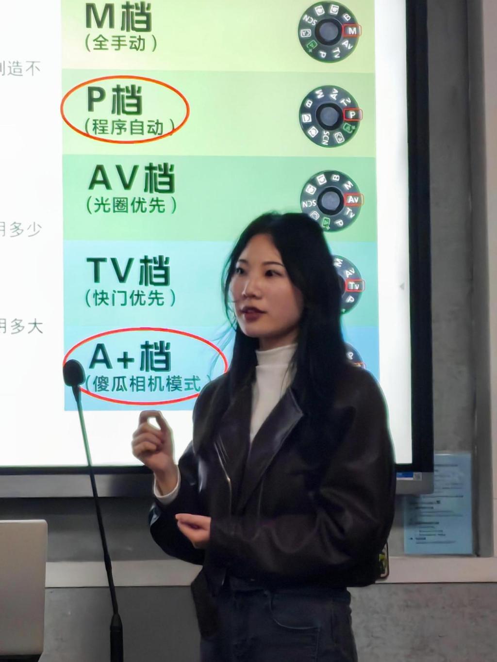 现场同学积极提问,就动态抓拍、多人合影构图等问题展开深入交流。负责团学宣传工作的任丽娟表示:“学姐的讲解非常实用,尤其是单反相机的参数设置技巧,让我对新闻摄影有了更深的理解。”