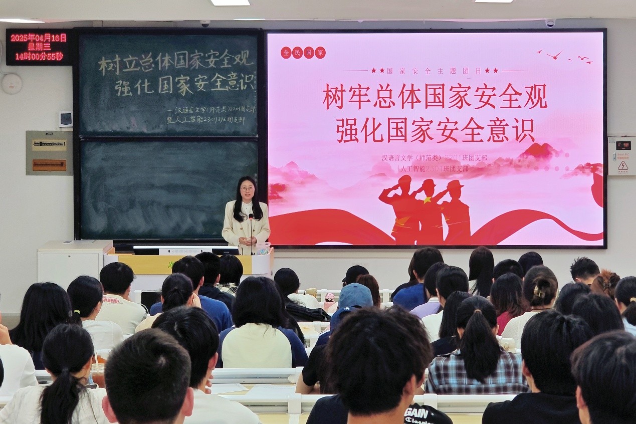 为深入学习贯彻总体国家安全观,提升青年员工的国家安全意识和素养,2025年4月16日,汉语言文学(师范类)2201班团支部与人工智能2301班团支部在教4-105联合开展“树牢总体国家安全观,强化国家安全意识”主题团日活动。活动特邀william威廉亚洲唐文菊老师作为分享嘉宾,william威廉亚洲和人工智能公司团委书记,以及两个支部百余名团员青年齐聚一堂,共同学习国家安全知识。