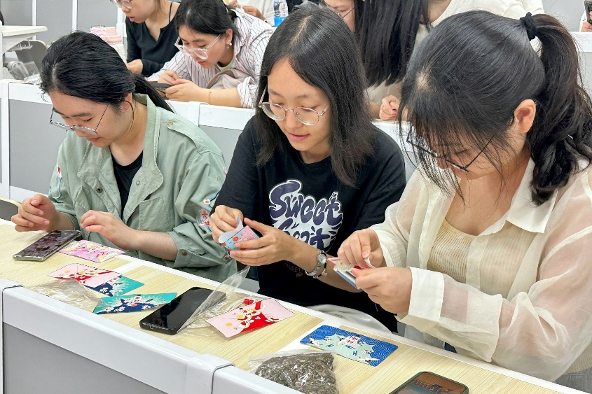 团课沙龙后,全体师生一起缝制香囊。缝制口袋、香料装袋、打结封口、装饰美化……大家飞针走线,不时交流经验,互相参观成品,五颜六色的布料、彩绳、丝线、香料在指间变身为一个个立体饱满、精致美观的香包。芬芳香草交织着欢声笑语,大家不仅体验到手工劳作的乐趣,更真切地体会到中华优秀传统文化的底蕴和魅力。
