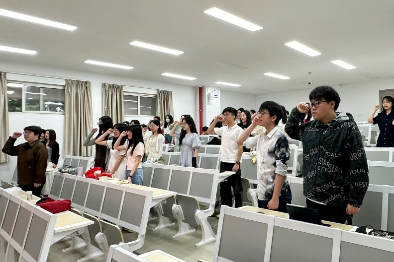 在激昂庄严的中国共产主义青年团团歌声中,团日活动拉开序幕。团支部书记阮乐专题宣讲习近平总书记给谢依特小学戍边支教西部计划志愿者服务队队员的回信精神,并领学习近平总书记《在庆祝中华全国总工会成立100周年暨全国劳动模范和先进工作者表彰大会上的讲话》。她号召全体团员脚踏实地、奋发进取、拼搏奉献,将“请党放心、强国有我”的铿锵誓言书写在推进中国式现代化新征程上。