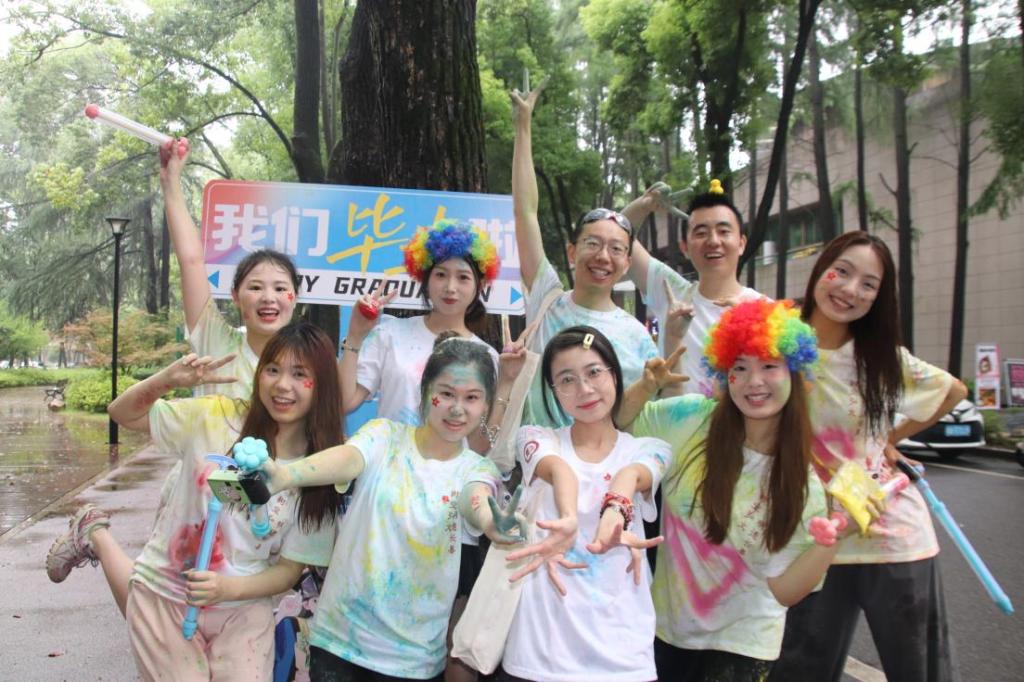 随着发令声响,毕业生们一同冲出起点,相继穿过泡泡拱门,沿二、三号体育馆之间的路线奋力向前。途经校门、逸夫人文楼、嘉会园,最终抵达求索广场。彩色的粉末在雨中晕染,混合着雨水流淌在每个人的脸上、衣服上,形成独特的“彩虹雨”。