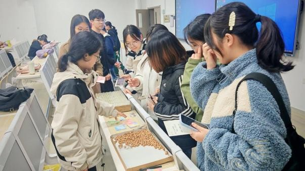 在长江新区校区,同学们驻足摊点,有序领取明信片与漂流瓶,即刻投入创作,将心底思绪转化为文字。夜幕降临,武昌校区的活动在教室中温馨开启,同学们为漂流瓶装饰色彩,贴纸、小摆件等元素让原本朴素的瓶子成为独特的“情感容器”。大家亲手折叠写满情思的纸条,仔细塞进瓶中,用木塞“封印”期许,期待这份心意能传递给素未谋面的有缘人;同学们还别出心裁制作“漂流明信片”,让文字传递多了一份创意与温度。