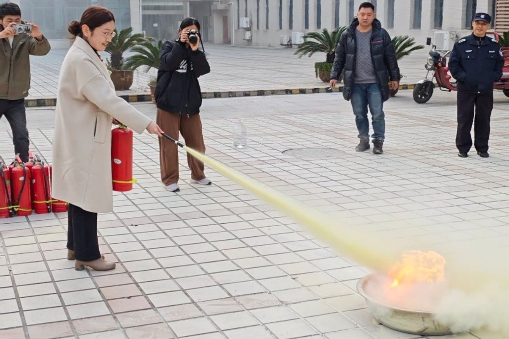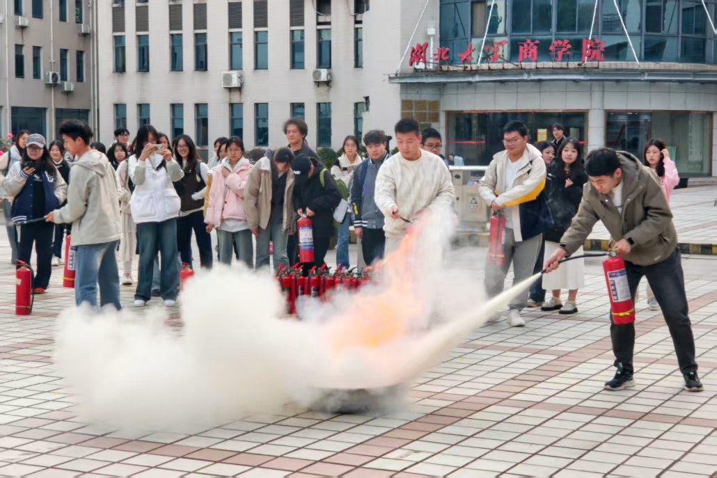 随后,全体师生来到逸夫人文楼广场,开启消防灭火演练。“提起来,拔掉保险销,握住喷管对准火源根部,压下手柄!”在教官的口令指挥下,同学们分组实操,干粉喷洒处,火源迅速熄灭。