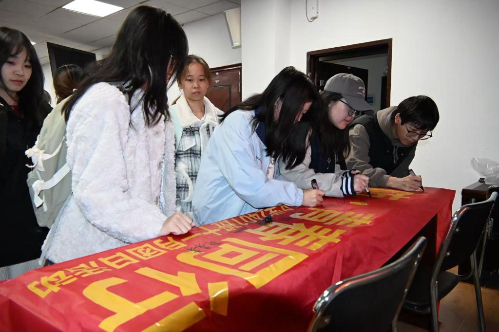 演练结束后,师生们回到逸夫楼B6016报告厅,三位同学先后分享灭火心得,结合自身所见所闻,号召大家共建文明宿舍、平安校园。最后,全体师生起立庄严宣誓,在“全民消防 青春同行”横幅上有序签名,并合影留念。