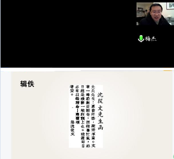 紧接着,在文献研究的方法与路径方面,梅杰老师根据自身文献整理和研究经验给出了三点建议,即文献研究要立足于文本、要采访知情人、要遵守文献研究的一般规律。最后,梅杰老师以沈从文、周作人和张爱玲三人等相关的具体史料事件强调了辩伪的重要性、介绍了“辑佚、考证、注释”等研究方法。