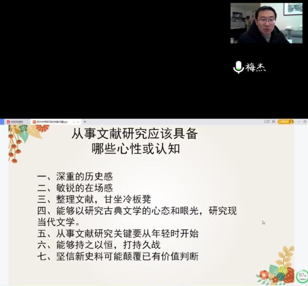首先,梅杰老师介绍了文献学的学术发展趋势,指出文献学是一门实操性很强的学科,而文献学研究中的文献整理工作和文献研究工作两者是相辅相成的,任何一方都不应受到轻视。其次,梅杰老师就从事文献研究应具备哪些心性或认知这一问题,提出了七个方面的素质,即深重的历史感、敏锐的在场感、甘做冷板凳的心境、能够以研究古典文学的心态和眼光来研究现当代文学的态度、从事文献研究要从年轻时开始的建议、持之以恒的精神以及坚信新史料可能颠覆已有价值判断的信念。